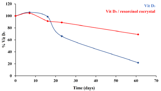 CIRCE Scientific has discovered new cocrystals of Vitamin D3 that significantly improve its stability. On the one hand, the cocrystal showed much higher stability to light (80% retention after 2 months under 5,000 Lux lighting, vs. 20% retention of commercial Vitamin D3).