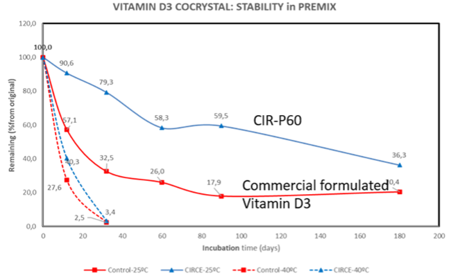 Finally, an experiment performed in collaboration with the Autonomous University of Barcelona showed that in a premix containing Vitamin D3, other vitamins, minerals and choline chloride (the worst-case scenario regarding degradation of Vitamin D3), CIRCE Scientific cocrystal was significantly more stable than a commercial Vitamin D3 formulated to increase its stability. After 3 months, the cocrystal retained 60%, while the commercial formulated Vitamin D3 retained just 18%.